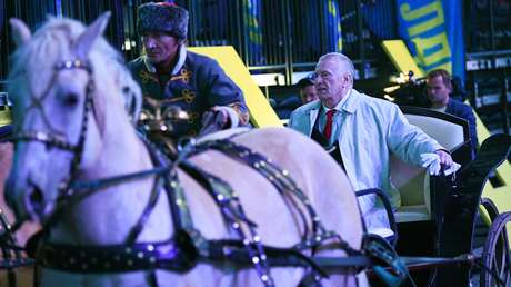 Ein Auftritt, als hätte er die Wahlen schon gewonnen: Der russische Politiker Wladimir Schirinowski ist am Montag zu einer Parteiveranstaltung in einer Pferdetroika eingefahren. Ein gestresstes Tier wollte beim Spektakel nicht mitmachen, streikte und hinterließ einen Misthaufen.